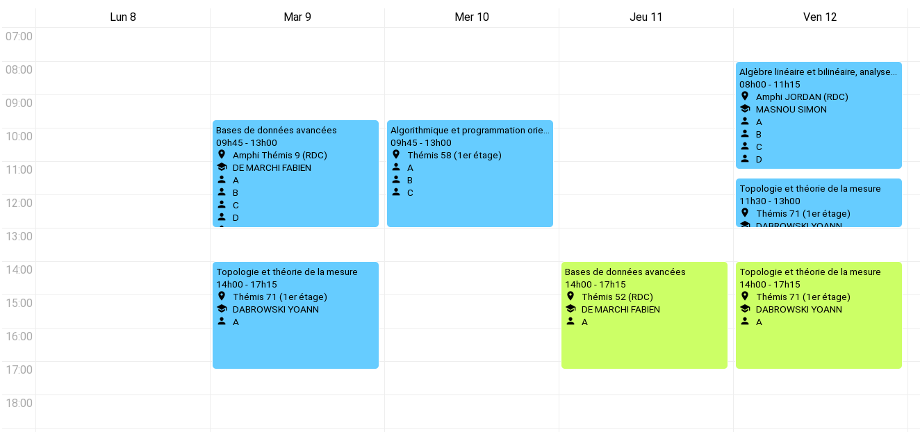 Voici les emplois du temps de la deuxième semaine pour le groupe A de TD : L2 ,L3 maths générales, L3 maths-info, L3 enseignement