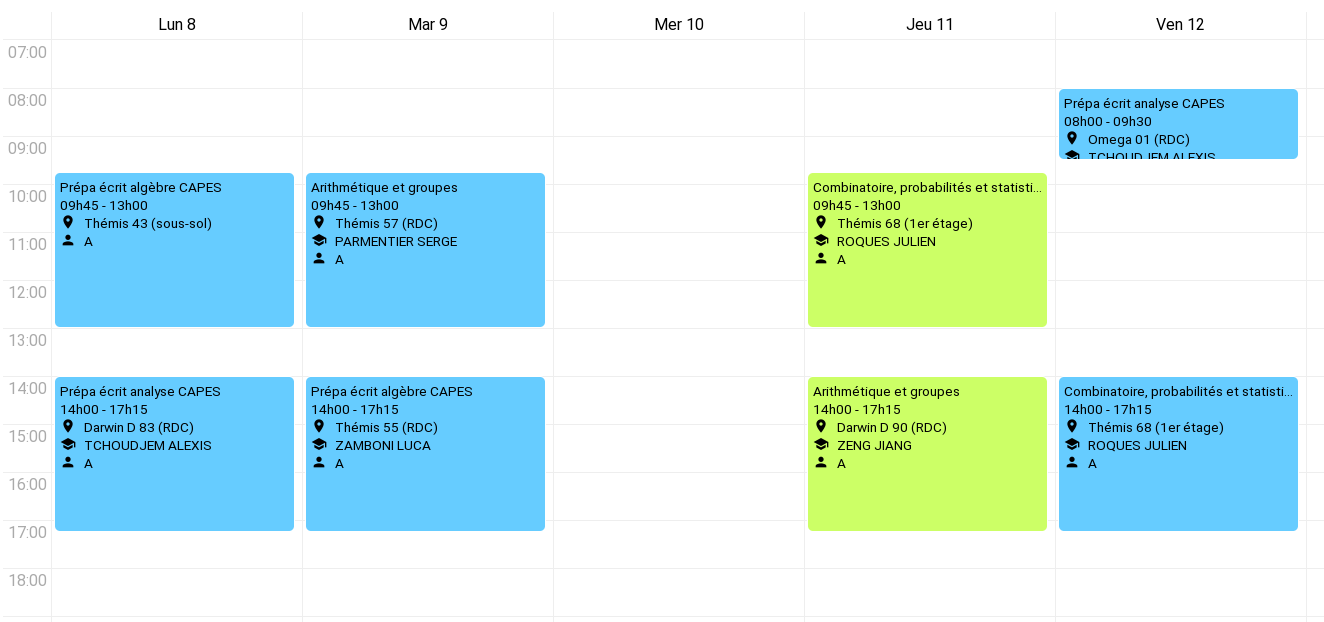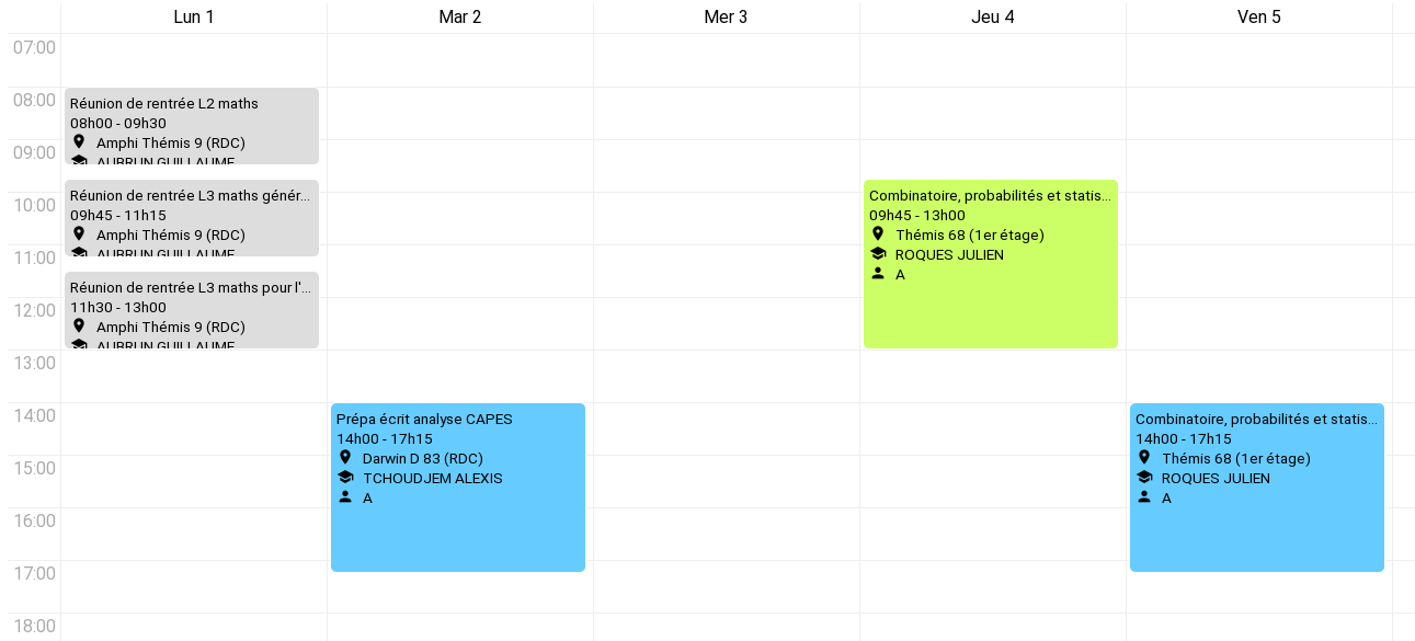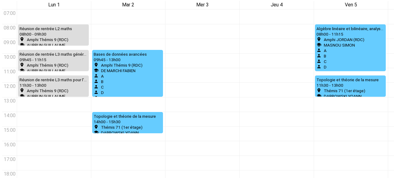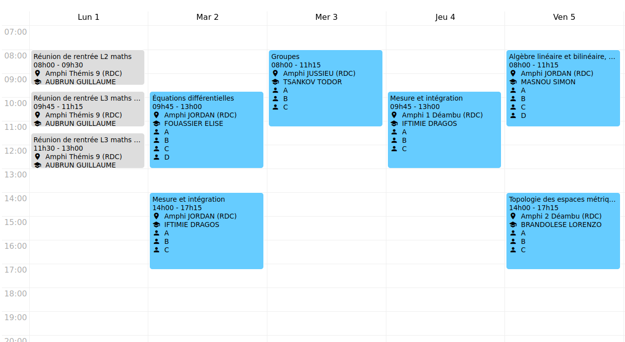 Voici les emplois du temps de la première semaine : L2, L3 maths générales, L3 maths-info, L3 enseignement